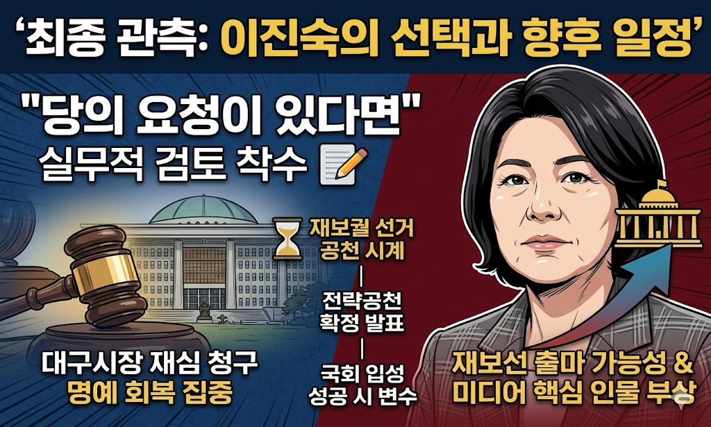 이진숙 전 위원장은 현재 대구시장 재심 청구를 통해 명예 회복에 집중하고 있지만, 동시에 재보선 출마에 대해서도 완전히 문을 닫지 않았습니다. 측근들에 따르면, 그녀는 당이 정말 나를 국회에서 필요로 한다면 피하지 않겠다는 의지가 강한 것으로 알려졌습니다. 이미 대구 수성구 등의 지역 사무실 임대 문의나 지지 그룹 결성 등 실무적인 움직임이 포착되고 있다는 후문이며 여의도 의사당으로 향할 가능성이 큽니다.